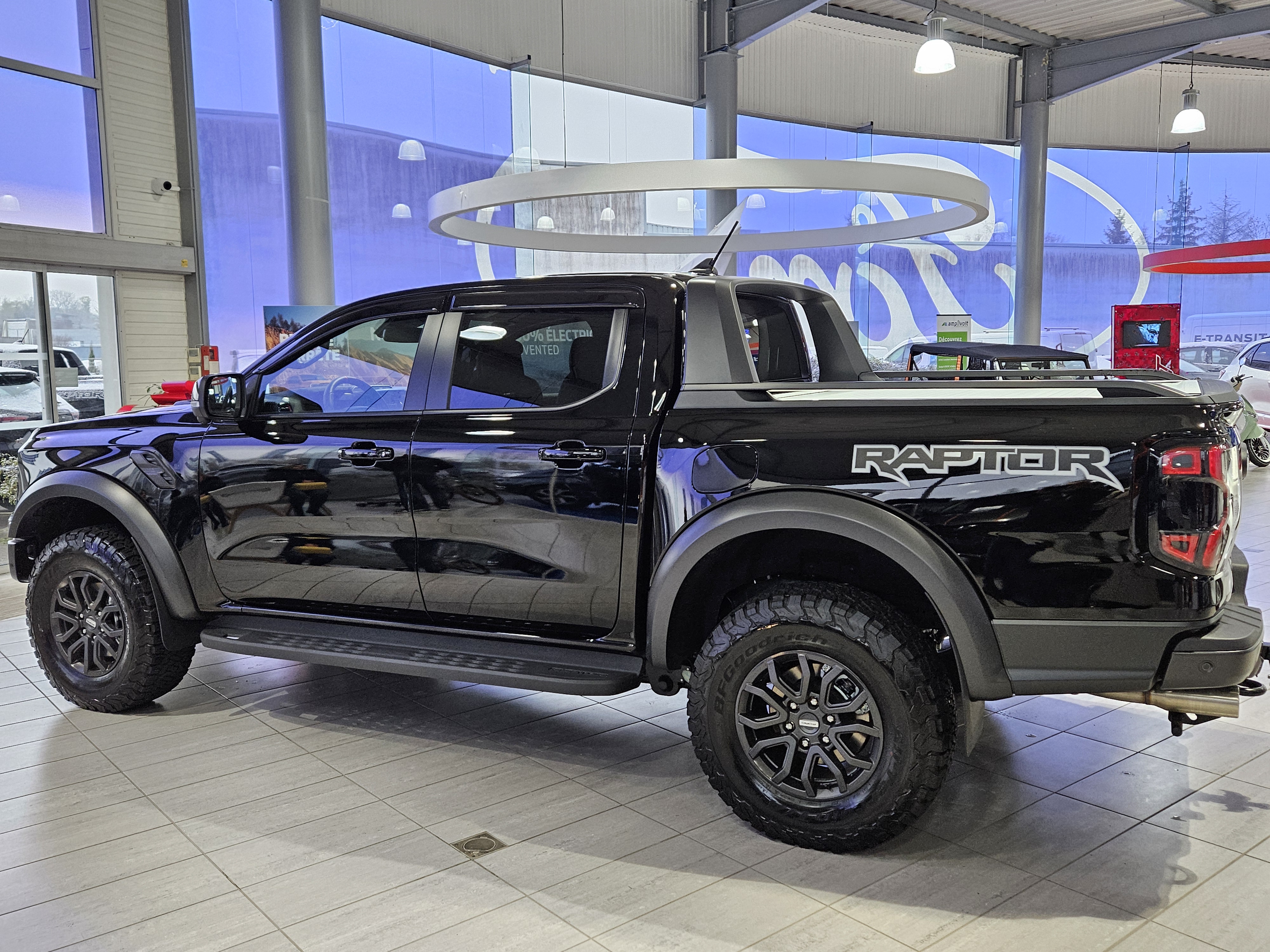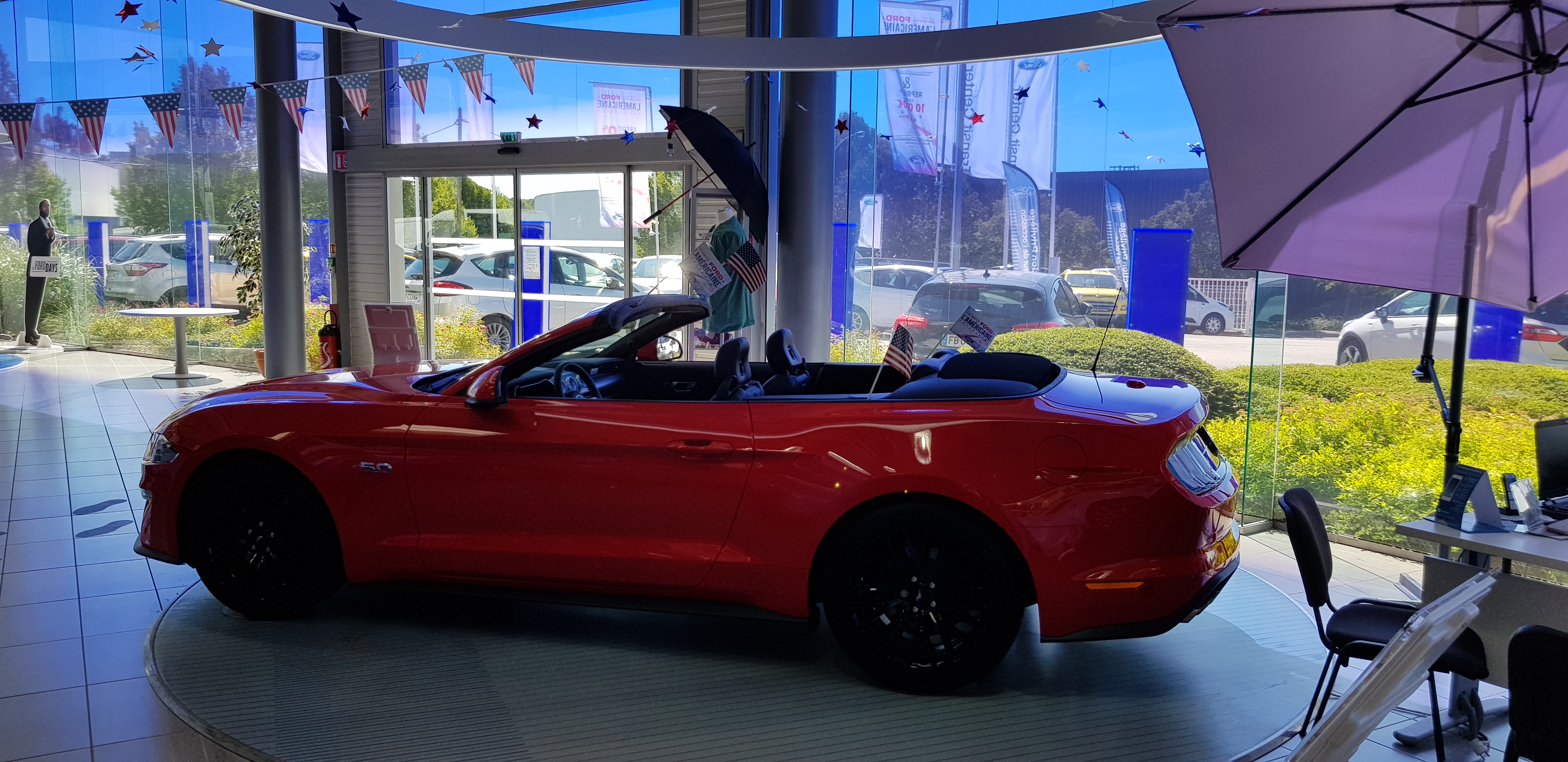 Très bel espace de vente. Quelque peu futuriste. Patienter dans l'espace salon-TV est apprécié. Pour les amoureux des voitures : présence de Mustangs.